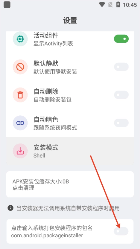6、如果还无法系统自带的安装程序时,可以启动该设置,输入apk的包名进行安装。