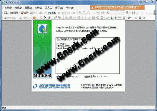 方正Apabi Reader V3.26 简体中文绿色免费版 方正Apabi Reader是用于阅读电子书(eBook)、电子公文等各式电子文档的浏览阅读工具,支持CEB、XEB、PDF、HTML、TXT多种文件格式。方正Apabi Reader的界面友好,尽量使阅读的感觉接近于传统纸书的阅读习惯,其主要功能有翻页、加批注、加划线、加书签、查找等等。常用的中英文电子词典软件,可以通过屏幕取词,对方正Apabi Reader中的词进行翻译