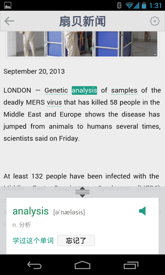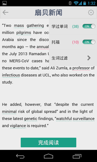 3. 每篇文章中的生词或短语都可以即时添加到自己的学习计划中,利用扇贝网站或者扇贝单词客户端强大的记忆系统进行学习;
