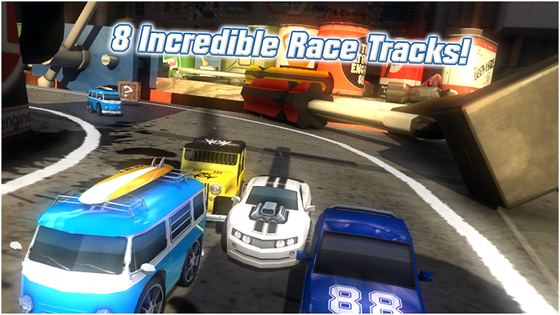 Table Top Racing是一款风格非常卡通的赛车队长游戏,赛车的造型都非常迷你,赛道也是将生活中各种桌面3D化而成的,包括中西式的餐桌、儿童的玩具桌等。玩家在游戏中的任务就是通过收集路上的道具攻击对手、保护自己和加速前进,感觉类似于跑跑卡丁车的道具赛。