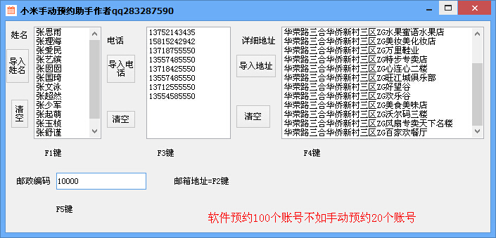 1.名字一行一个 电话一行一个 地址一行一个 编辑好后导入到软件中2.到预约网址填姓名的地方按按一下f1 邮箱f2.....