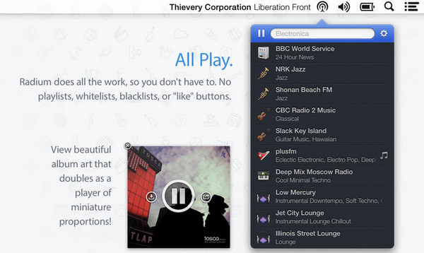 导入任何外部站只需通过拖动它的URL ,播放列表文件,或iTunes列表条目镭的菜单栏图标。