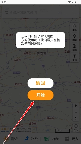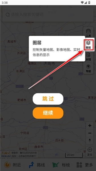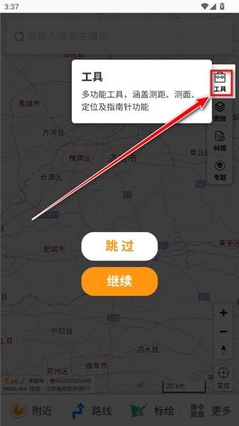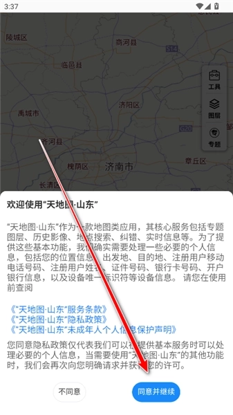 1.请安装并打开最新版的天地图山东,点击同意并继续。