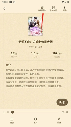 2、进入阅读页面,点击“离线缓存”选项。