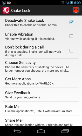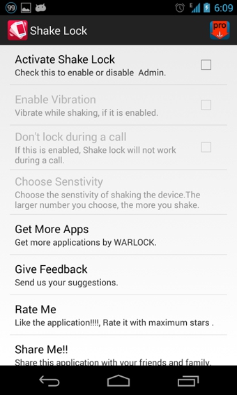 安卓摇动锁屏软件为锁定屏幕提供方便。你可以通过只晃动你的device.This锁定屏幕非常简单,重量轻应用,没有ads.With这个程序,你不需要按电源键锁定屏幕。只要安装该应用程序并激活它。设备管理员(这仅仅是允许锁屏,没有别的),并选择合适的灵敏度和应用就可以使用了。刚刚退出该应用程序,并动摇它。