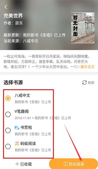 2、找到自己喜欢的阅读小说后,既可以选择书源,也可以点击优化阅读。