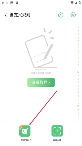 2、进入【自定义规则】页面后,点击底部的【规则市场】按钮,即可进入规则资源库,从中选择现成规则导入使用。
