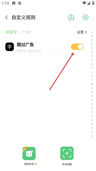 4、回到【自定义规则】页面,找到已导入的【跳过广告】规则,打开其右侧的开关,就能启用该规则来实现相应功能。