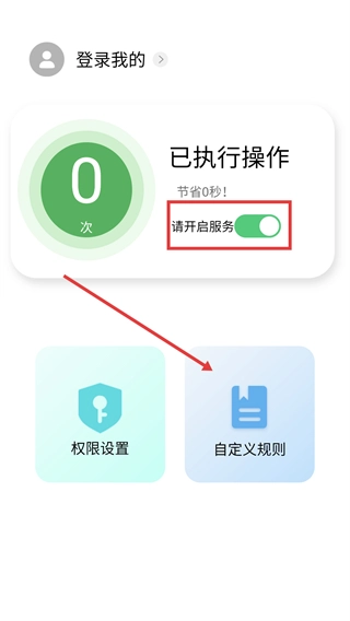 1、在主界面打开【请开启服务】的开关后,点击【自定义规则】选项进入规则管理页面,就能开展规则的创建或导入操作。