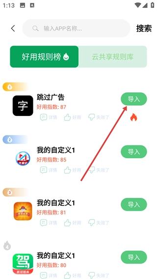 3、在【规则市场】的【好用规则榜】里,找到你想要的目标规则(例如“跳过广告”),点击该规则对应的【导入】按钮,就能把这个规则添加到自定义规则列表中。