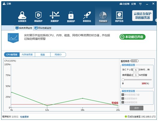 云锁能够实现对网站性能数据的可控可观,可对这些数据(并发连接数、吞吐量等)根据实际工作情况在云锁里设定一个“危险警戒线”,当出现异常情况时会及时报警通知。