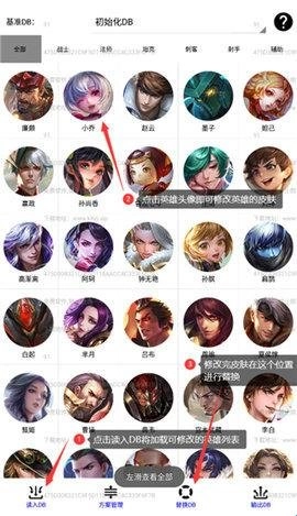 2、点击“读入DB”按钮可加载可修改的英雄列表,点击英雄头像即可对英雄皮肤进行修改,后续皮肤修改操作也在此处完成替换。