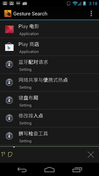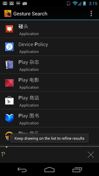 《Google手势搜索 Google Gesture Search》用户只需启动该应用之后在屏幕上用手指画出某个字母,程序可以自动识别并开始搜索。Gesture Search支持手机全局搜索,包括联系人、信息、应用、书签、音乐等内容。Google手势搜索 Google Gesture Search:手势操作应该还算是比较局限的一个操作,相对来说,大家还是喜欢点啊点点,不过谷歌这个手势操作还是需要支持,支持中文不容易。