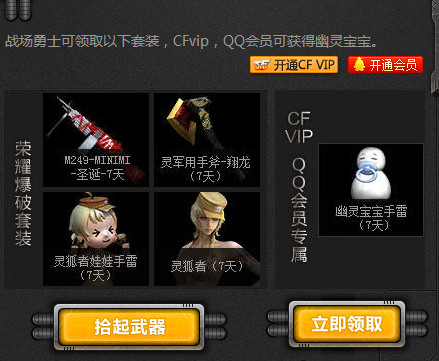 3、战斗勇士可以免费领荣耀套装,CFvip、QQ会员可获得幽灵宝宝(7天)。荣耀套装以页面展示为准。每个QQ号限领一次;
