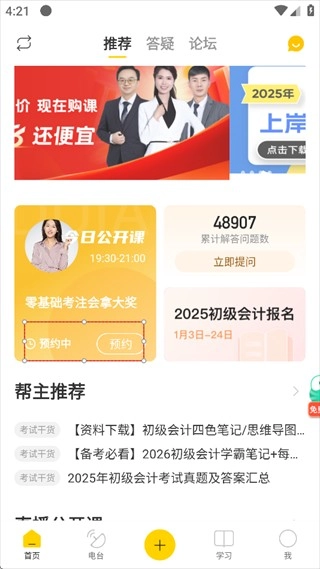 这里为您提供一段意思相近的新文本: 除了基础功能外,该平台还整合了全面的会计学习资源,从实务操作到理论法规,从经典题库到名师讲解,全方位助力用户提升专业能力,高效掌握核心知识。