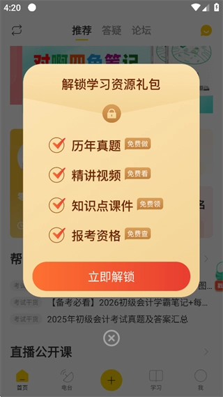 软件内自然配备了刷题功能,你可以先点击【学习】板块,再从中选择题库或模考等选项来进行练习。