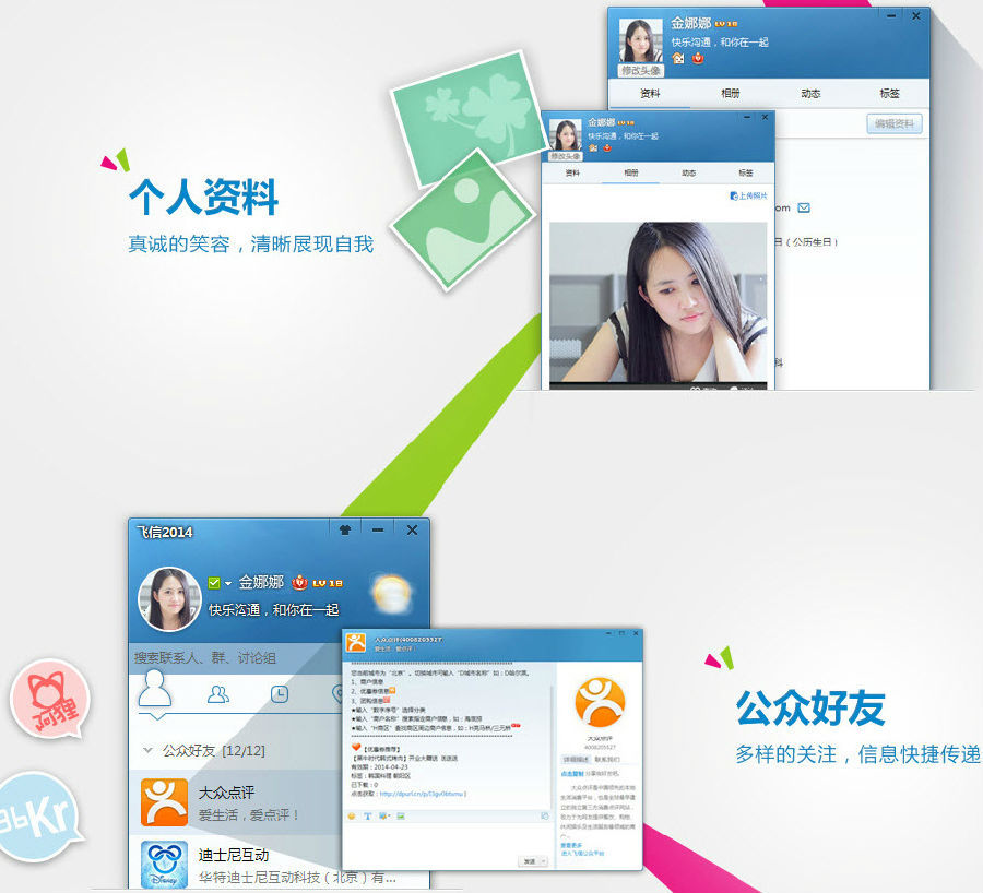飞信2015和沟通版为基于全新构架开发的版本,性能更加稳定,更适应目前互联网的前沿技术发展趋势。该版本主要宣传功能为“视觉更新”、“屏幕分享”、“个人资料”、“身边”和“公众好友”。