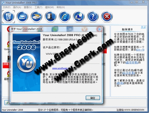 Your Uninstaller(FIX) V6.2.2009.10 多国语言绿色特别版 利用Your Uninstaller! ,你可以轻松查看到各种工具软件的卸载信息,根据卸载信息的提示,可以知道哪些程序可以被彻底地卸载;除了具有卸载功能外,该程序还具有启动程序管理功能,利用该功能你可以自定义各种需要随计算机系统一起启动的应用程序;此外,为方便你使用鼠标右键,该工具还新增了IE上下文菜单管理功能,利用这个功能你能提高计算机的操作效率。