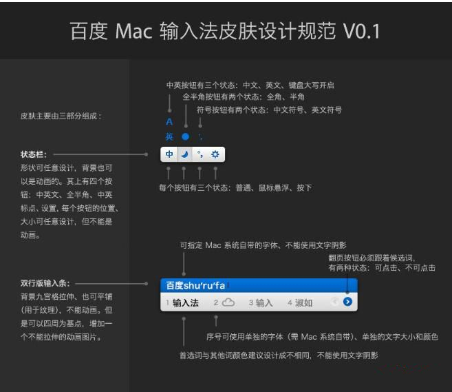 为了提升Mac用户的输入体验,百度Mac输入法3.0隆重推出皮肤功能,以「最美输入」为理念,同步推出了 知名设计师系列 以及 Weico系列 等精美皮肤,并独家支持动态皮肤,给予设计师更多的施展空间。百度Mac输入法所有皮肤作品都由专业的UI设计师精心设计,支持Mac用户喜爱的单/双行模式,且每个作品下都附上设计师的名字及其个人主页,为用户提供优质皮肤选择的同时,也予以了设计师充分的肯定和尊重。