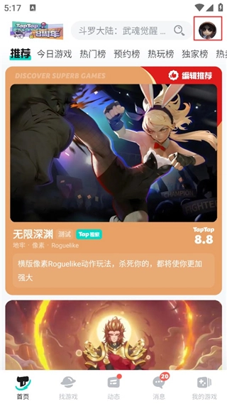 1、在本站完成TapTap登录后,点击右上角的头像打开相关界面;