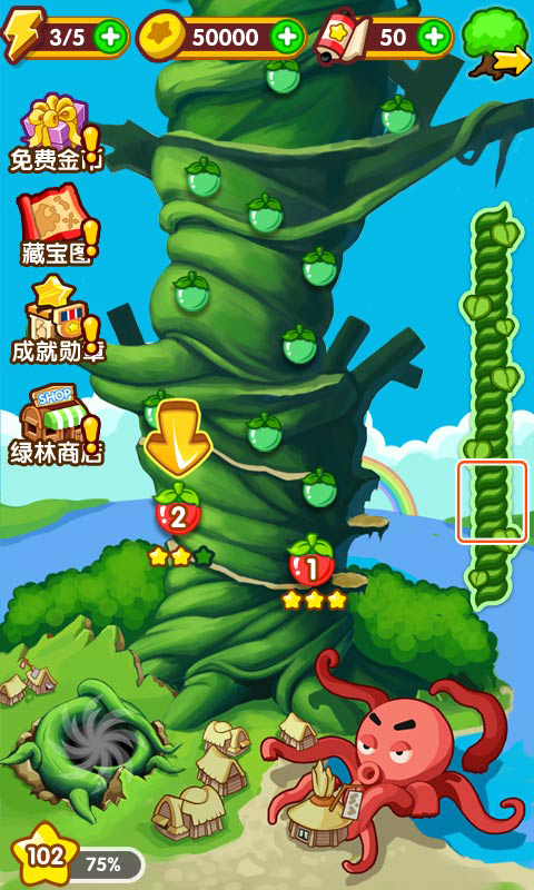 《天天砰砰砰》安卓版手游刚刚进入游戏的界面就能够看到像智慧树一样的大树,这是游戏的关卡,从树的最低下开始,一关一关的往上爬,直到树的最顶端。另外,这款游戏还有绿林商店,成就勋章,藏宝图,免费金币等多种功能,能够使玩家一享游戏的欢乐。