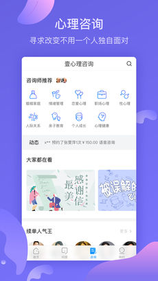 壹心理手机版以国外self-help自励自助的理念,打造中国最大的心理轻问诊平台。壹心理手机版连接了全国的5000多位心理咨询师进驻,其中包括500位经过严格认证的优秀咨询师,为你随时随地专业解答心事;另外还有数以万计的心理学人和网友在上面做你的心事后援团,给你最温暖的陪伴。【软件特色】