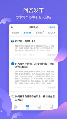 1、专业贴心:5000位心理咨询师进驻,为来访者提供专业的心理轻问诊,有需要的话还可以通过免费语音预约服务与咨询师一对一解答心事。2、助人自助:self-help,每一位来访者在上面都可以为需要的人提供真正的帮助和建议,成为助人达人,在助己的同时,陪伴更多需要帮助的人。