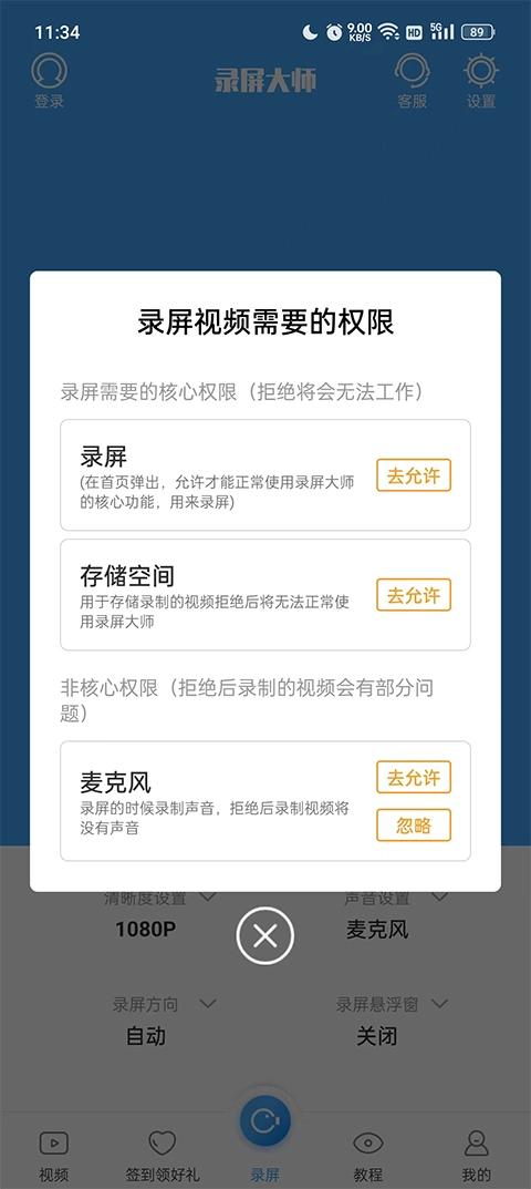 3、点击“开始录制”,按照提示授予录屏、存储和麦克风权限后就能启动录制;
