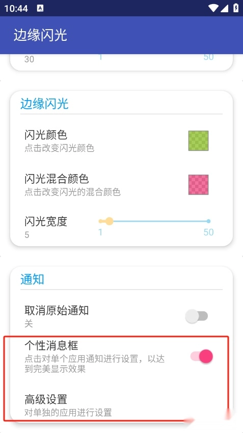 就像三星S8的侧屏闪光功能,当收到通知栏消息时就会闪烁(需指定要提醒的应用),还能调整线条的颜色、宽度、边角弧度以及动画速度。