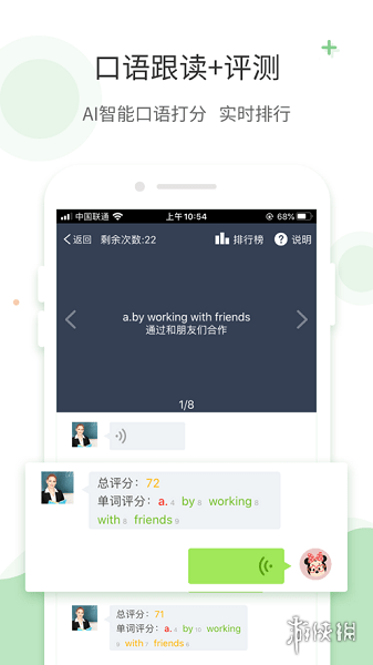2、跟读评测环节配备AI智能评分功能,同时有专业老师协助纠正发音;实时更新的排行榜机制,助力孩子在轻松愉悦的氛围中提升口语能力。