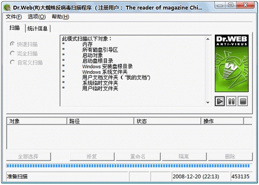Dr.Web Antivirus for Windows ,这是一款俄罗斯出品的功能强大的杀毒防毒工具,俄罗斯国家科学院合作开发的,军方和克里姆林宫专用。采用新型的启发式扫描方式,北斗的壳,外面再加壳,加 跳针也可以干掉,占用内存很少。可以说Dr.Web是最强的引擎,提供多层次的防护方式,紧紧的和你的操作系统融合一起,拒绝接纳任何包含恶意的 代码进入你的电脑,比如病毒、蠕虫、特洛伊木马以及广告软件、间谍软件等等。Dr.Web也新型的基因式扫描杀毒软件。可以预防并清除 22000 种以上的病毒及特洛伊木马,其中包括各种高复杂多变异型的病毒。Dr.Web曾在 1994 年做为第一个可以根除 OneHalf 病毒的杀毒软件而享誉欧洲。Dr.Web 可以对各类 Word 毒做出快速反应,并进行隔离和清除,系统资源控制完美,各大论坛样本区傲视群雄。脱壳能力超强.