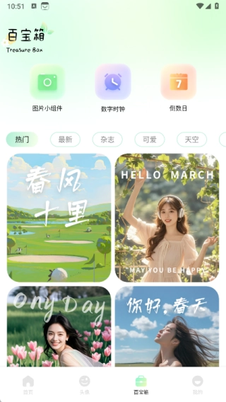 百宝箱页面里包含图片小组件、数字时钟、倒数日功能,以及各式各样的精美壁纸。