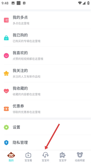 在应用的首页,点击底部导航栏中的【宝宝听】选项,即可进入宝宝听页面。