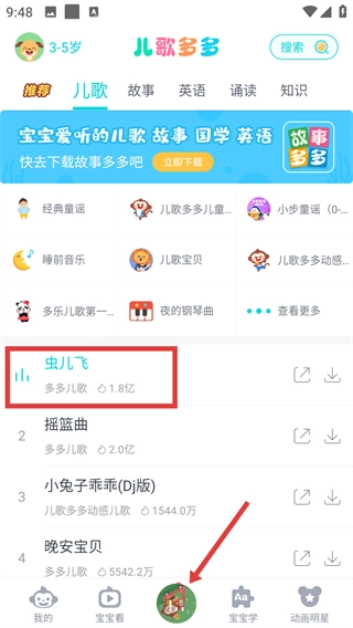 打开软件后,点击底部的【宝宝听】板块,进入音频内容区域,就能开始挑选想听的儿歌了。