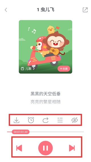在儿歌播放界面,你能点击播放按钮来播放儿歌,还可以开展收藏之类的操作。