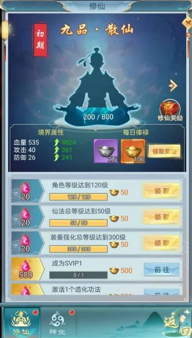 修仙是提升战力的一种途径,在修仙板块里能看到领取元宝的相关入口。玩家只要参与修仙,每提升十个等级就能获得丰厚的元宝奖励,此外每天还能领取固定的俸禄。