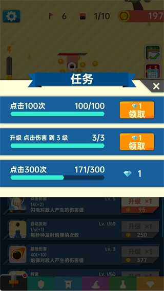 :完成指定目标(如点击100次、将点击伤害升至3级等)可领取钻石,钻石用于解锁高级功能或购买稀有道具。建议优先完成简单任务,快速积累资源。