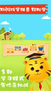 2、学韵母:借助可爱的卡通老虎形象,引导宝宝认读24个韵母。同时,通过“找一找”的答题环节,让知识学习变得更有趣味。