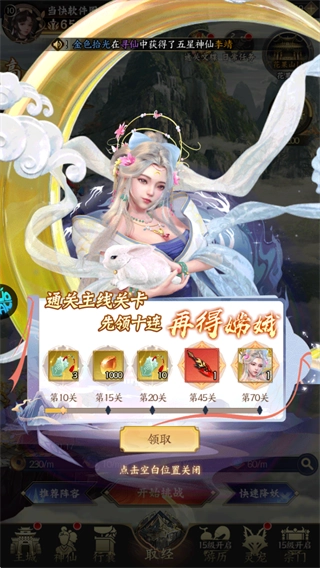 当主线关卡推进到70关时,就能领取五星嫦娥;而且在通关的过程中,还会获得大量仙玉、高级寻仙令之类的关键资源。