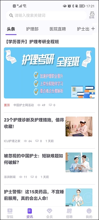 2. 在资讯板块,用户不仅可以查阅护理诊断措施、临床案例分析,还能获取护理考研全程班、职称晋升路径等深度内容,为职业发展提供有力支持。