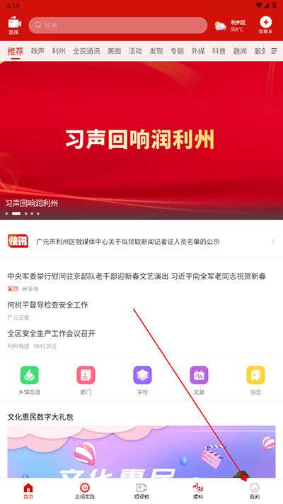 1. 打开利州融媒App的首页,点击底部导航栏里的“个人中心”按钮;