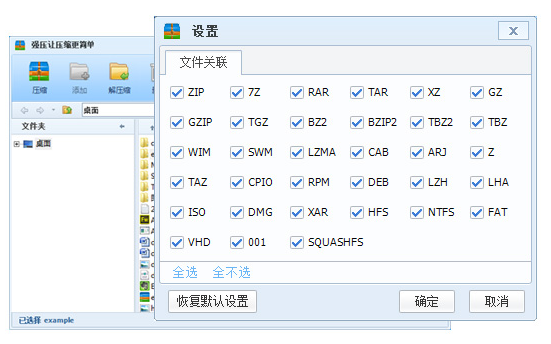 在强的右上菜单,点击【选项】,选择【设置】,并在新弹出的【设置】界面中,点击【文件关联】标签,通过勾选不同的压缩格式来更改软件默认的压缩格式关联,点击【确定】来确认更改的压缩格式关联。