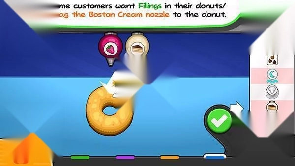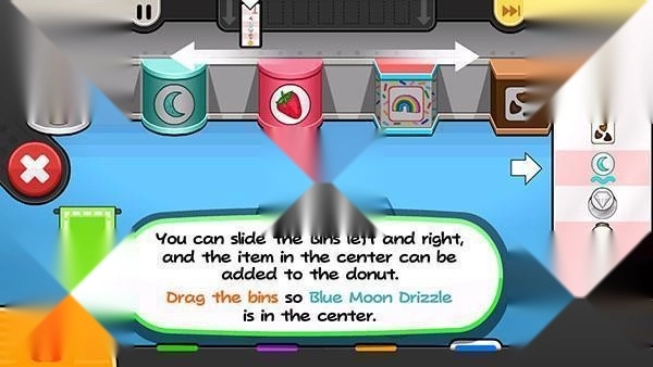 5、关于配料部分,可通过滑动操作切换到顾客指定的配料,再把它撒到甜甜圈表面。