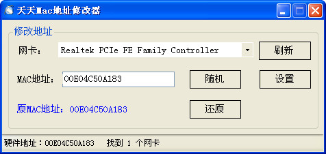 天天mac地址修改器是一个简单易用的小工具,方便修改网卡mac地址,可随机生成mac地址。在arp攻击越来越普遍的今天,修改网卡mac地址也不失为一个解决办法。【注意事项】