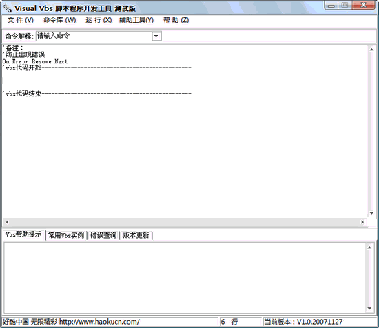 可视化脚本VBS编程开发工具。 功能:将VBS脚本编译成EXE文件,方便您的使用同时又保护vbs代码不被他人偷窥,支持操作系统:XP/2003/vista本程序的开发环境:Vista+Delphi 2007