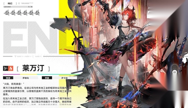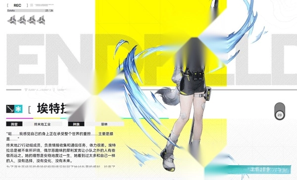 终末地组织的特勤成员,自小随母亲修习武艺,战斗素养扎实过硬,性格开朗而充满活力。作为副C定位的角色,她以近战刀具为武器,无需在战场久留,即可对周边敌人造成致命打击,能与多种阵容灵活适配。