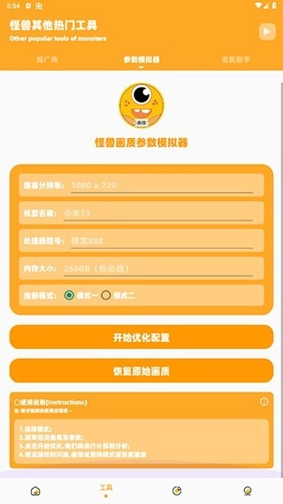 如果是新手也不用担心,zm666xyz芝麻画质怪兽还提供了画质参数模拟功能,只需选择【开始优化配置】,就能一键设置出合适的画质参数。
