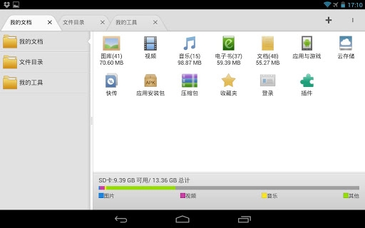* 我的文件:浏览图库、视频、音乐、电子书、文档、应用程式、安装包、压缩包,云存储和搜藏夹。