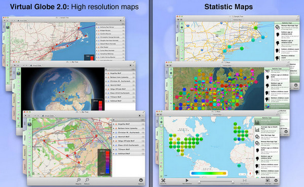 - 无数的图表和视图,如沙漏图、祖先图、时间线、双祖先图、统计图、扇形图、亲属图、家系图或虚拟地球仪。