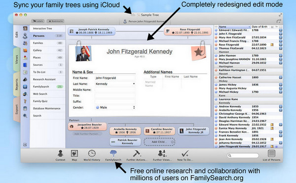 Mac 家谱 7 将为系谱来一次整容手术:它拥有现代交互式的界面,难以置信的迅捷而且易于使用。我们确信,家谱记录者们会为了 Mac 家谱 7 而更换他们以前使用的家谱记录方式。Mac 家谱能帮助您收集和记录关于您家族历史的种群和数据,将其转化为翔实的报告和图表。